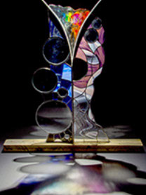 Sculpturen Ik maak sculpturen in diverse materialen, met glas als belangrijkste medium. Met technieken als glas-in-lood en Tiffany verbeeld ik verhalen – soms abstract, soms symbolisch, maar altijd persoonlijk. Elk werk is uniek en kan worden afgestemd op een persoonlijk verhaal én persoonlijk budget. Chibur Hiernaast staat een serie van vijf sculpturen die gemaakt zijn met glas-in-lood, tiffany, plexiglas, gegalvaniseerd staal, epoxy en diverse aanvullende materialen. Deze collectie is gemaakt voor Bethel en geeft per sculptuur de transitie weer van een betreffend onderwerp. Door op bovenstaande afbeelding (Beth-el) te klikken verschijnt de site waar meer informatie te vinden is.  Wave after wave 3-d object staal, pur, arduino, natuurlijke elementen, zwerfvuil, visdraad De gevolgen van klimaatveranderingen zijn overal zichtbaar; meer en extremere wateroverlast. Het schuimende water wat zich met kracht terug trekt van de oever, rukt zand, grond en stenen mee en laat een spoor achter van gebarsten klei, aangespoelde plantaardige en dierlijke elementen, vermengd met zwerfvuil. Toch proberen verschillende soorten planten zich hier nog staand te houden, planten die nodig zijn voor het leven op aarde, planten die de wereld(bevolking) kan redden. Eendenkroos; Het levert tien keer zoveel eiwit per hectare als soja en groeit razendsnel. Nu wordt regenwoud gekapt om plaats te maken voor akkers met sojaplanten, grotendeels voor veevoeder. Ook heeft het een zuiverende werking op water: het haalt er stikstof en fosfor uit om te groeien. In verschillende landen wordt eendenkroos al op grote schaal gebruikt om afvalwater te zuiveren.
