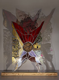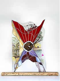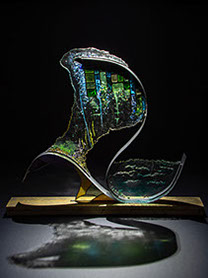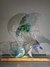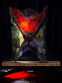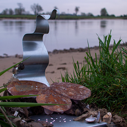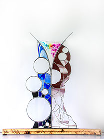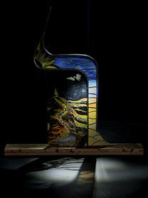 Sculpturen Ik maak sculpturen in diverse materialen, met glas als belangrijkste medium. Met technieken als glas-in-lood en Tiffany verbeeld ik verhalen – soms abstract, soms symbolisch, maar altijd persoonlijk. Elk werk is uniek en kan worden afgestemd op een persoonlijk verhaal én persoonlijk budget. Chibur Hiernaast staat een serie van vijf sculpturen die gemaakt zijn met glas-in-lood, tiffany, plexiglas, gegalvaniseerd staal, epoxy en diverse aanvullende materialen. Deze collectie is gemaakt voor Bethel en geeft per sculptuur de transitie weer van een betreffend onderwerp. Door op bovenstaande afbeelding (Beth-el) te klikken verschijnt de site waar meer informatie te vinden is.  Wave after wave 3-d object staal, pur, arduino, natuurlijke elementen, zwerfvuil, visdraad De gevolgen van klimaatveranderingen zijn overal zichtbaar; meer en extremere wateroverlast. Het schuimende water wat zich met kracht terug trekt van de oever, rukt zand, grond en stenen mee en laat een spoor achter van gebarsten klei, aangespoelde plantaardige en dierlijke elementen, vermengd met zwerfvuil. Toch proberen verschillende soorten planten zich hier nog staand te houden, planten die nodig zijn voor het leven op aarde, planten die de wereld(bevolking) kan redden. Eendenkroos; Het levert tien keer zoveel eiwit per hectare als soja en groeit razendsnel. Nu wordt regenwoud gekapt om plaats te maken voor akkers met sojaplanten, grotendeels voor veevoeder. Ook heeft het een zuiverende werking op water: het haalt er stikstof en fosfor uit om te groeien. In verschillende landen wordt eendenkroos al op grote schaal gebruikt om afvalwater te zuiveren.